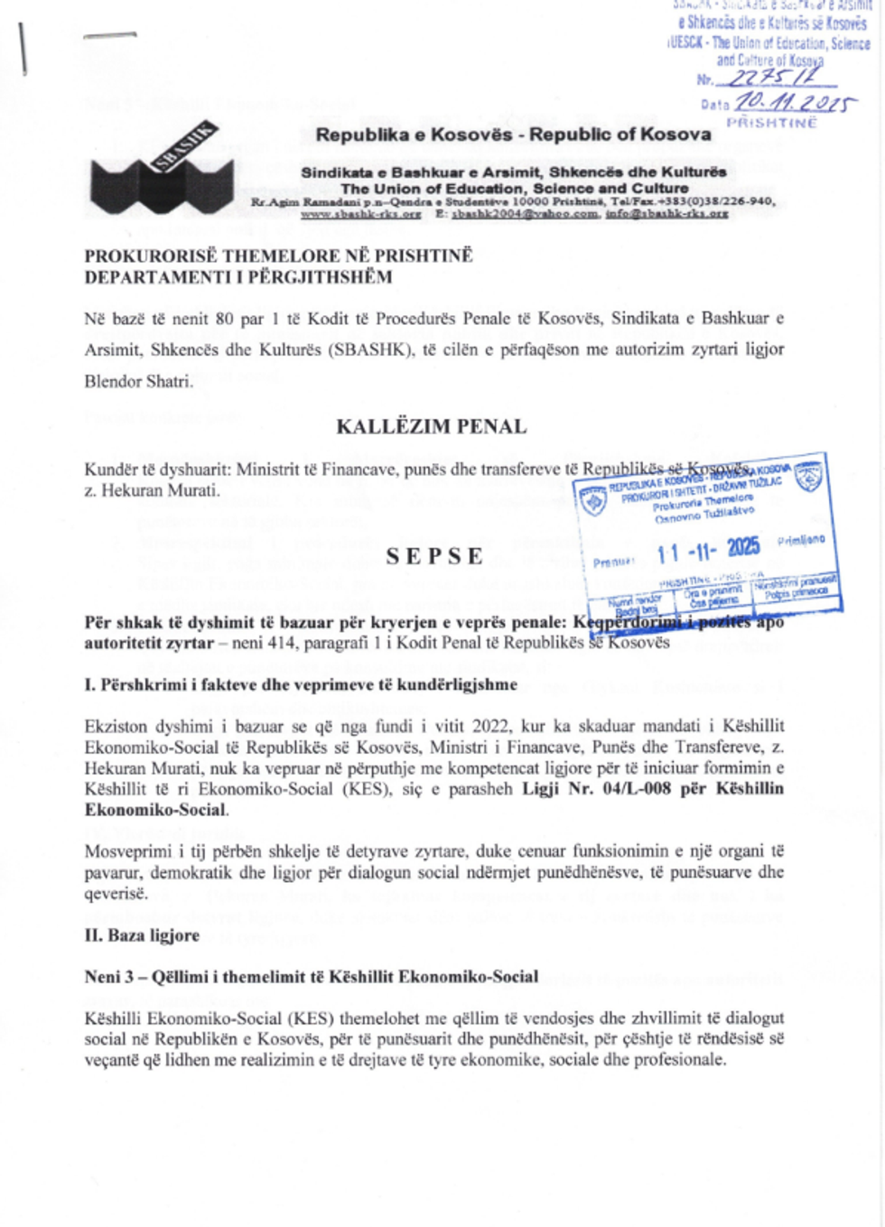Sindikata e Bashkuar e Arsimit, Shkencës dhe Kulturës (SBASHK) ka dorëzuar kallëzim penal në Prokurorinë Themelore në Prishtinë, ndaj ministrit në detyrë të Financave, Punës dhe Transfereve, Hekuran Murati.