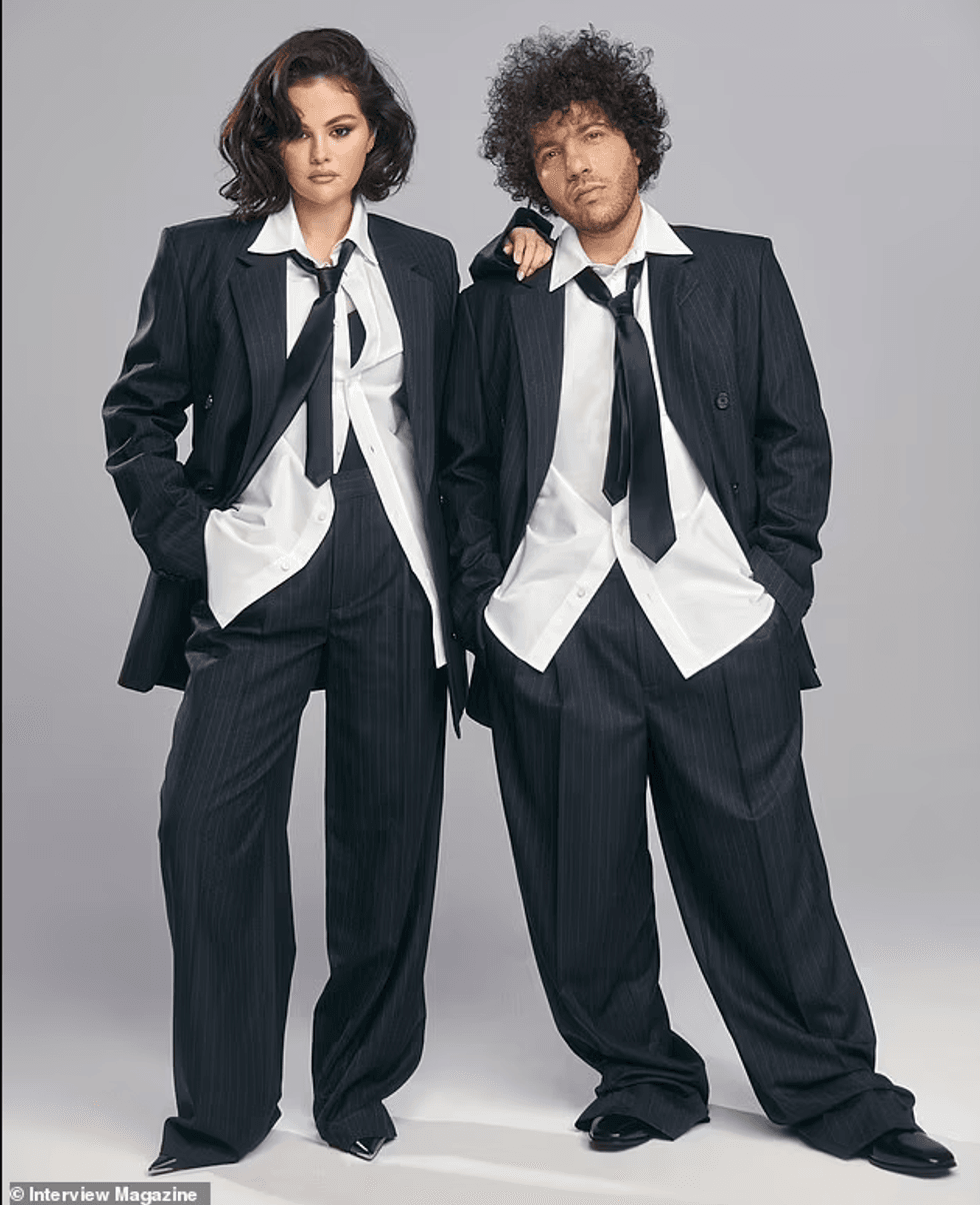 Në një nga imazhet, ata duken me veshje të koordinuara, me xhaketa gri me shirita dhe pantallona të lirshme, ndërsa në një tjetër, Benny vishet si kalorës, dhe Selena e prek butësisht nën mjekër.