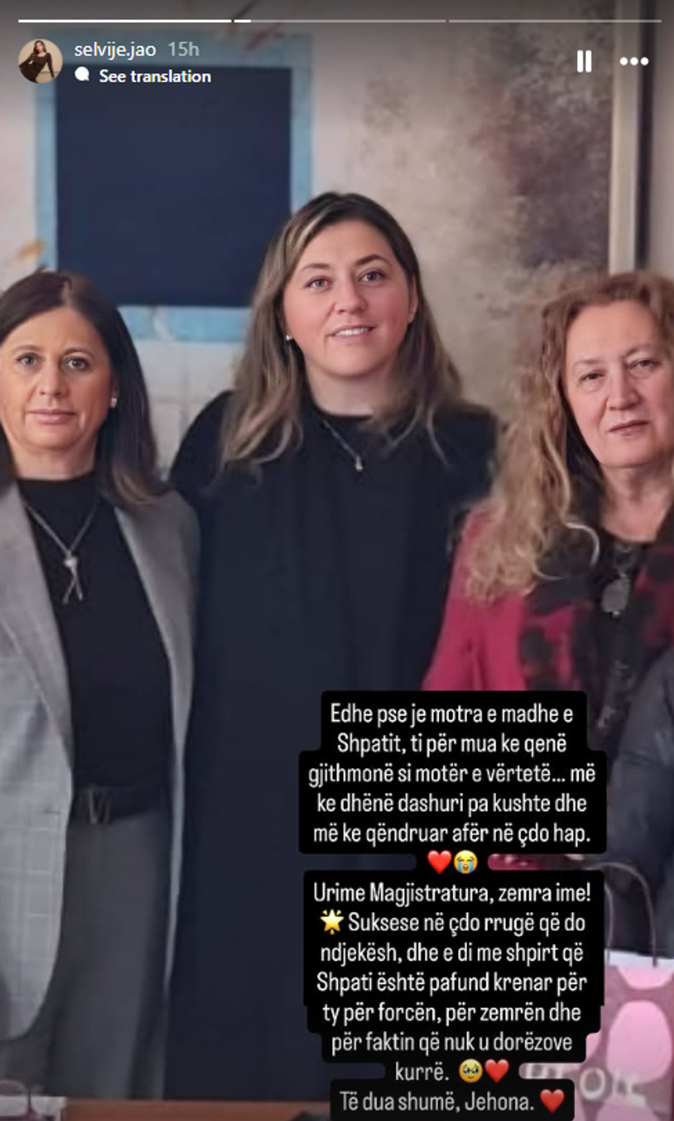 "Edhe pse je motra e madhe e Shpatit, ti për mua ka qenë gjithmonë si motër e vërtetë...më ke dhënë dashuri pa kushte dhe më ke qëndruar afër në çdo hap", u shpreh ajo.