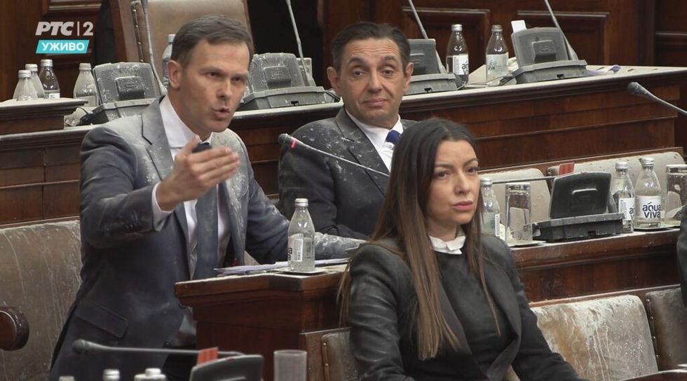 Sërish kaos në Kuvendin e Serbisë, deputetët hedhin vezë mbi Bërnabiqin dhe ministrat – aktivizojnë aparatin për fikjen e zjarrit
