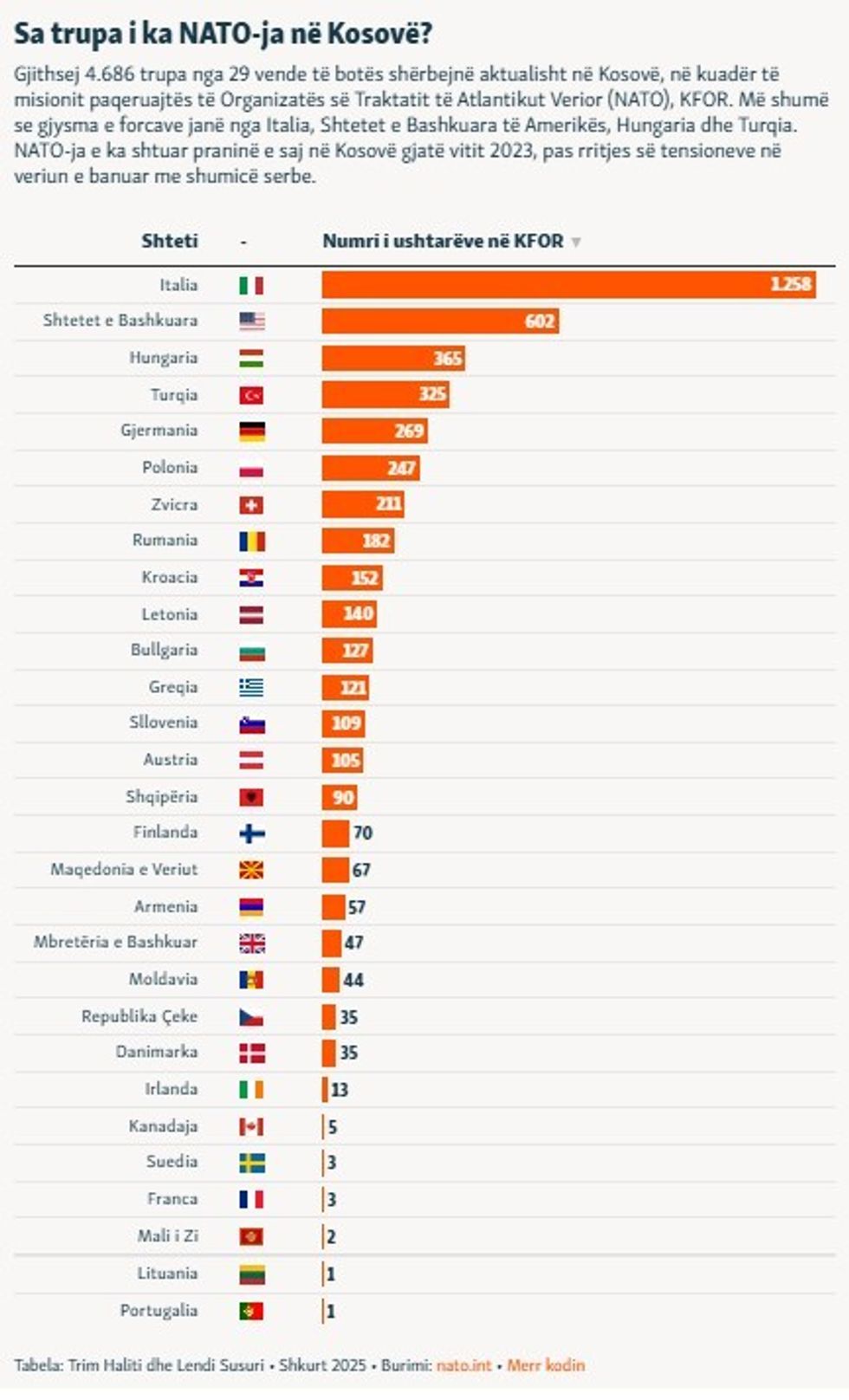 NATO ka mision paqeruajtës në Kosovë që nga përfundimi i luftës. Aktualisht, në kuadër të KFOR-it janë mbi 4.600 trupa nga 28 vende të botës që janë të dislokuar në Kosovë. Numri më i madh i tyre është nga Italia, pasuar nga Shtetet e Bashkuara të Amerikës, Hungaria dhe Turqia.