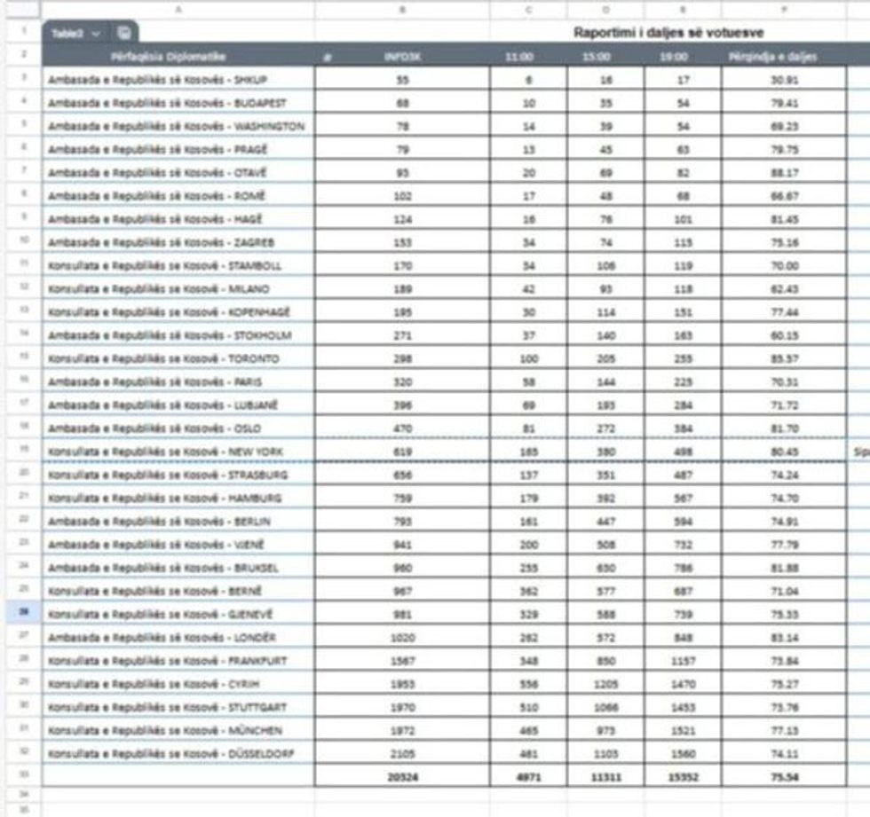 Nga 20 mijë 324 qytetarë me të drejt vote për të votuar në përfaqësitë diplomatike të Kosovës, Komisioni Qendror i Zgjedhjeve ka njoftuar se kanë votuar 15.552 ose 73.56 përqind.