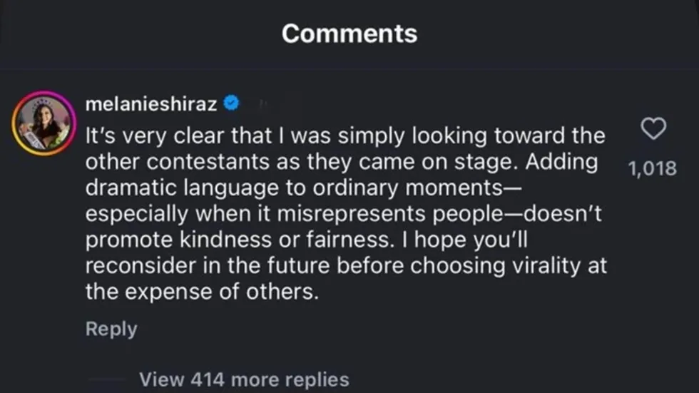 Pasi mori shumë kritika, Shiraz vendosi të mbrohej në komentet poshtë postimit të saj në Instagram. "Është shumë e qartë se unë po shikoja vetëm konkurrentët e tjerë ndërsa ata ecnin në skenë", shkroi izraelitja.