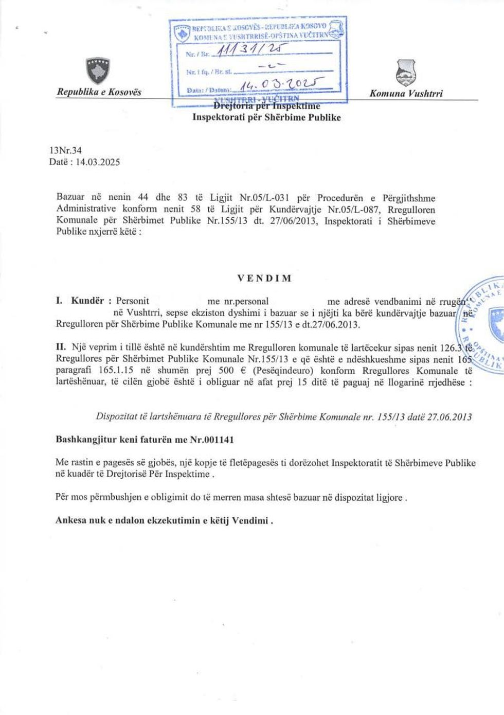 Drejtoria për Inspektime në Komunën e Vushtrrisë pas verifikimit të rastit ka shqiptuar gjobën në shumën prej 500 euro, shkruan Telegrafi.