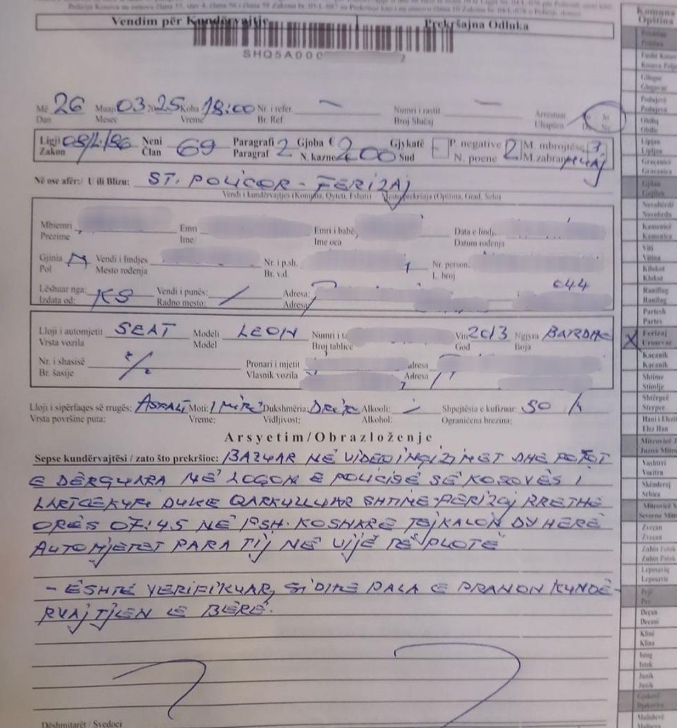 “Policia e Komunikacionit Rrugor në Ferizaj, me datën 26.03.2025, ka pranuar një video nga një qytetar, ku shihet një veturë SEAT LEON me targa vendore që kryen tejkalim në vijë të plotë në rrugën magjistrale Ferizaj-Shtime, saktësisht në fshatin Koshare. Pas identifikimit, shoferi Sh.A,(26 vjeç) u ftua në stacionin e policisë në Ferizaj dhe iu shqiptua një gjobë prej 200 euro, 2 pikë negative dhe masa e pezullimit të patentë-shoferit për 3 muaj”, thuhet në komunikatën e Policisë/Telegrafi/