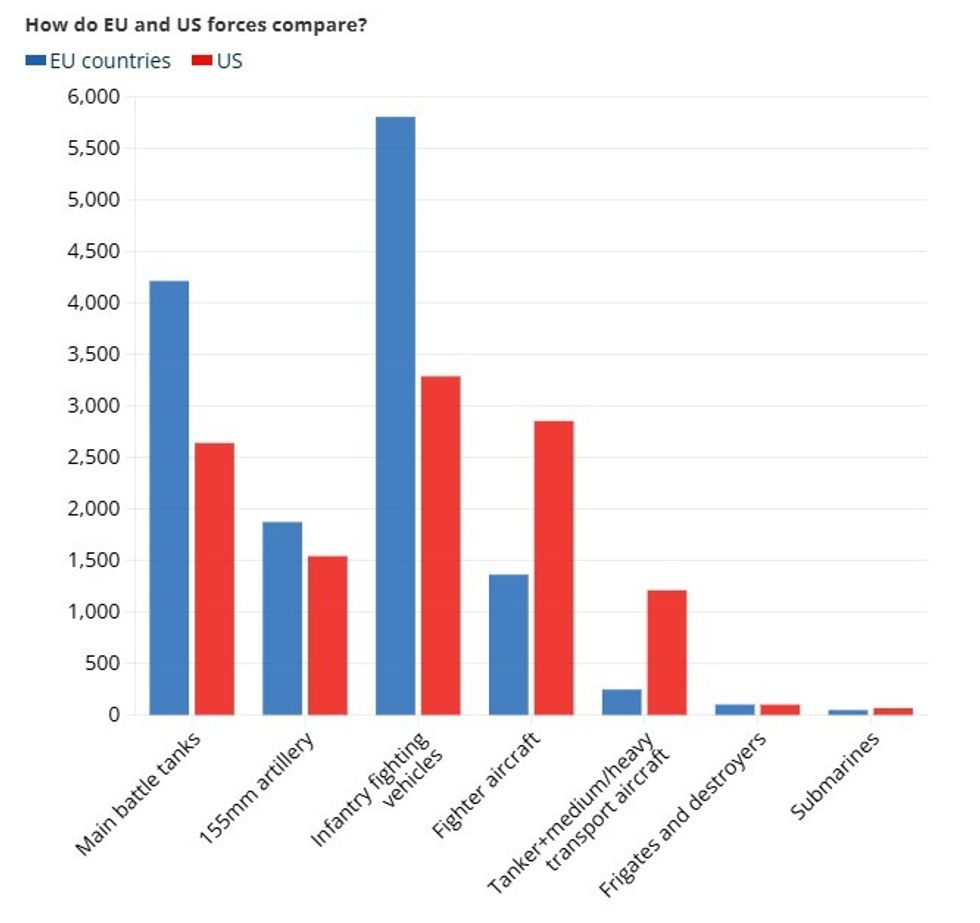 Agjencia Evropiane e Mbrojtjes (EDA) krahasoi gjithashtu forcat e BE-së me ato të SHBA-së.