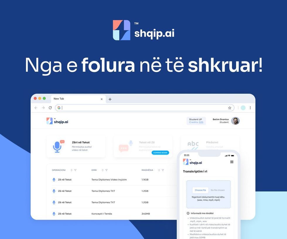 Shqip.ai është platforma e parë e cila ju lehtëson shqipfolësve të krijojnë tekste të shkruara nga përmbajtjet audio-vizuale, duke i hapur mundësitë për përdorim të gjerë në fusha të ndryshme si në gazetari, akademi, hulumtim, krijim përmbajtjeje dhe shumë fusha të tjera.