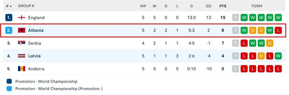 Me fitoren e sotme, Shqipëria është ngritur në pozitën e dytë në tabelë me tetë pikë, pasi kanë dy fitore, dy barazime dhe një disfatë.