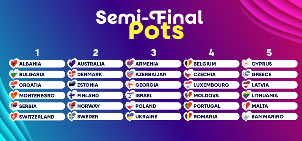 Para shortit, vendet u ndanë në pesë grupe bazuar në modelet historike të votimit, të përllogaritura nga partneri zyrtar i votimit të Eurovision-it, 'Once', me qëllim një shpërndarje sa më të balancuar.