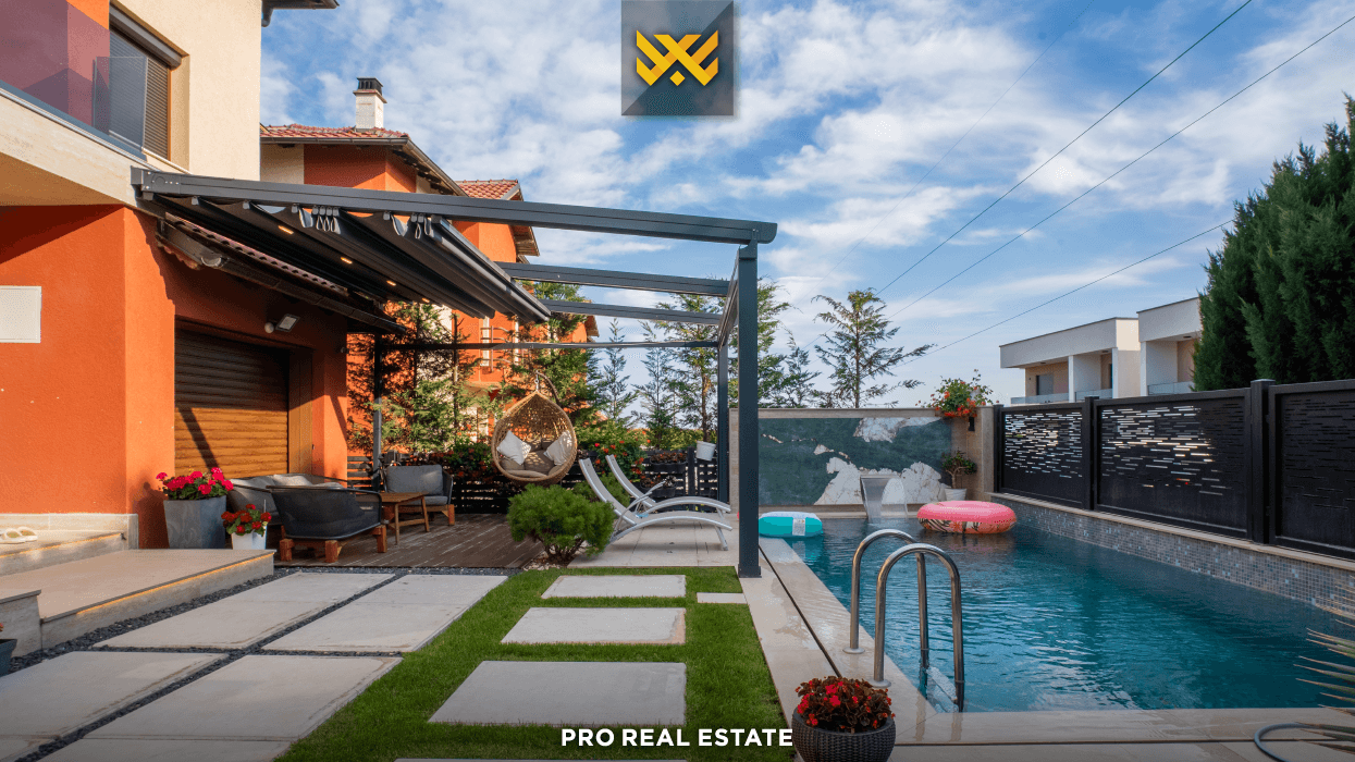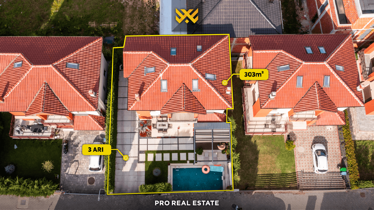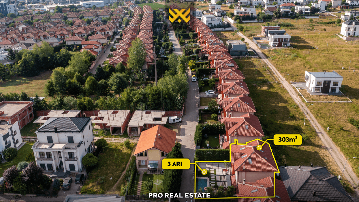 Prona ndodhet në truall me sipërfaqe 3 Ari, ku përfshihet kopsht me pamje relaksuese, pishinë dhe hapësira të jashtme për shfrytëzim. Po ashtu, ofrohet vendparkim për deri në tri vetura.