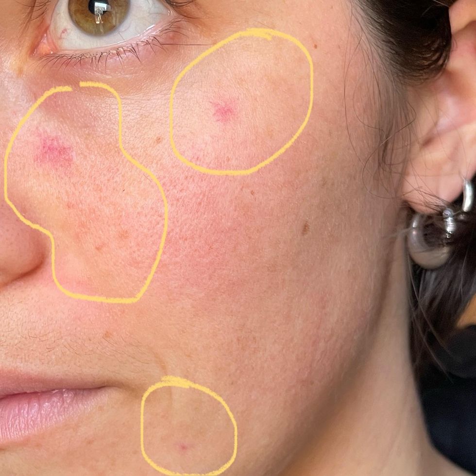 ▪ Njollë e rrafshët ose pak e ngritur, e kuqe deri në vjollcë në lëkurë, e ngjashme me një puçërr të vogël