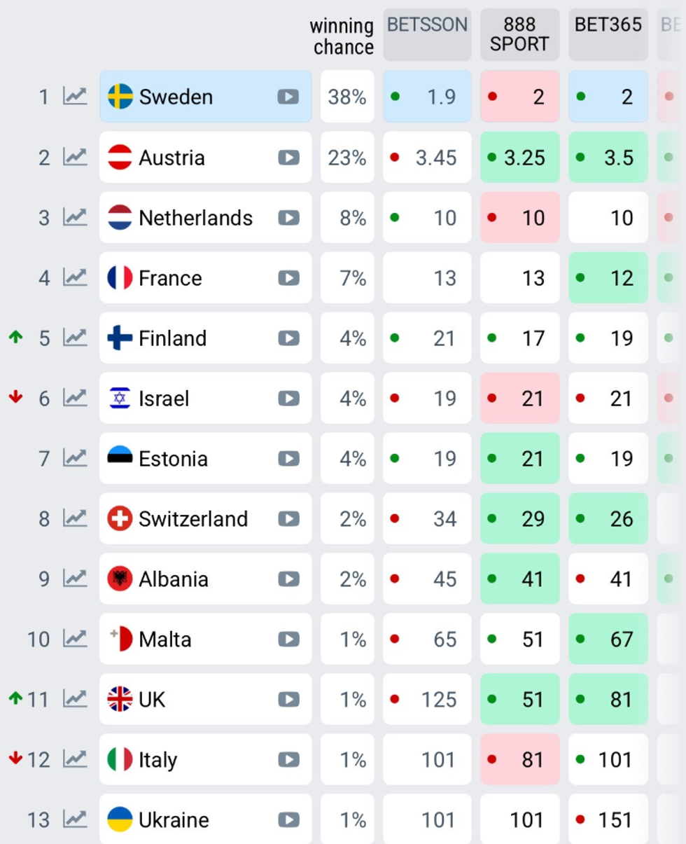 Agjencitë e basteve parashikojnë vendin e parë për Suedinë, të cilës aktualisht i japin një shans prej 38% për ta fituar.