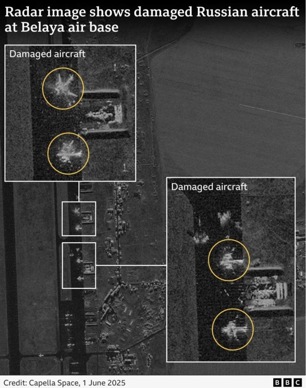 Imazhet satelitore të radarit të ndara nga Capella Space, zbulojnë të paktën katër bombardues rusë me rreze të gjatë veprimi të dëmtuar rëndë ose të shkatërruar në bazën ajrore Belaya. Kjo përputhet me pamjet e dronit ukrainas që tregojnë gjithashtu një sulm ndaj një bombarduesi Tu-95.