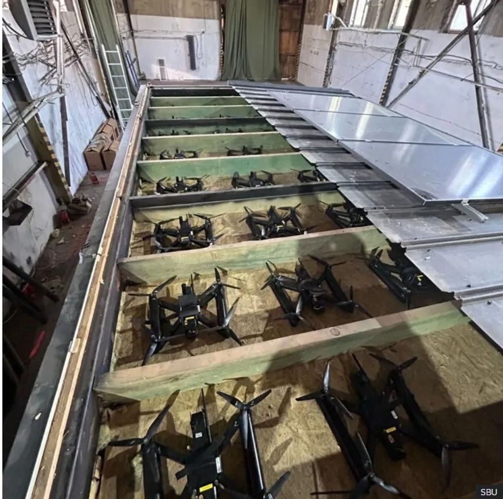 Imazhet e ndara nga SBU tregojnë dhjetëra dronë të vegjël të zinj të fshehur me kujdes në kabina druri brenda një depoje, të cilën blogerët ushtarakë rusë e përcaktuan si një vendndodhje në Chelyabinsk.
