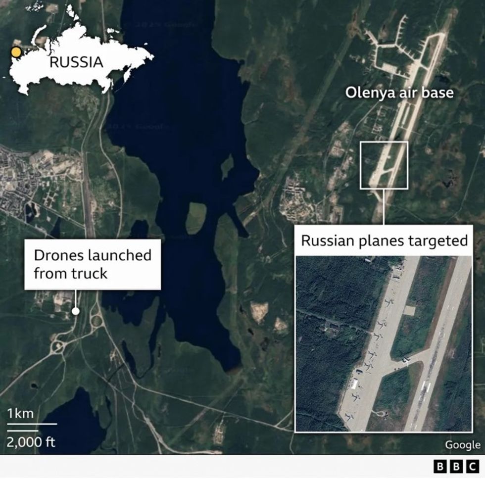 Në fotot e publikuara menjëherë pas sulmit, Vasyl Maliuk, kreu i Shërbimit të Sigurisë së Ukrainës (SBU), mund të shihet duke parë një hartë satelitore të fushave ajrore në të cilën bazat në vendet e listuara nga Rusia, janë qartësisht të identifikueshme.