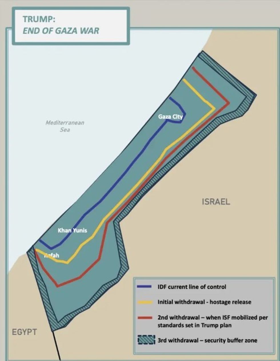 Të hënën, Shtëpia e Bardhë publikoi një hartë, e cila tregon linjat e ndryshme të tërheqjes së trupave izraelite, në rast se do të vihej në zbatim plani i paqes i presidenti amerikan, Donald Trump.