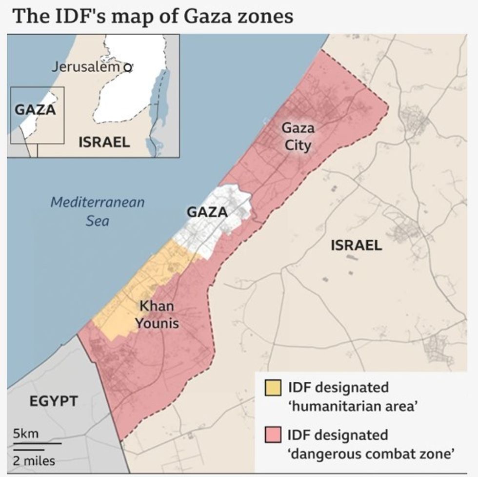 Më poshtë është versioni më i fundit i hartës së vetë IDF-së, që tregon zonën të cilën ushtria izraelite e quan "zonë luftarake të rrezikshme", e cila mbulon rreth 80 për qind të Gazës. Gjithashtu tregohet pjesa jugore e Gazës që përshkruhet si "zonë humanitare". /Telegrafi/