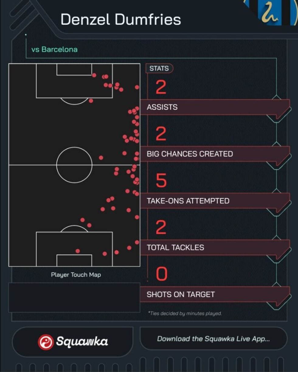 Denzel Dumfries shënoi dy dhe asistoi tre nga shtatë golat e Inerit në dy ndeshjet, duke luajtur një rol të madh në suksesin e skuadrës së tij. 29-vjeçari dërgoi topin përpara për golin hapës të Lautaro Martinez në minutën e 21-të, pasi theu mbrojtjen e lartë të Barcelonës me një vrapim të zgjuar mes mbrojtësve qendrorë.