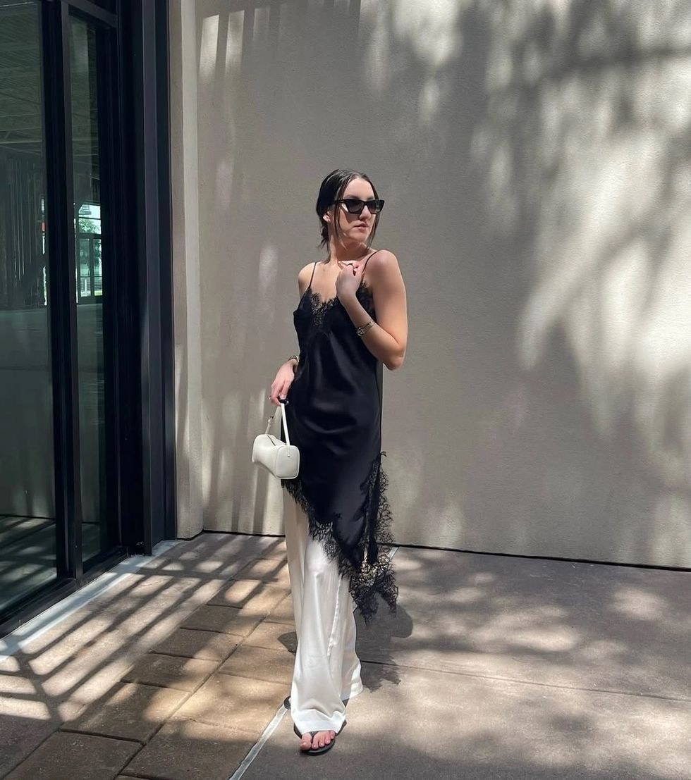 Për ato që duan eksperimentet dhe rikthimin e stilit të viteve 2000, ‘slip’ fustani mbi pantallona të gjera apo të lehta duket shumë trendi. Zgjedhja ideale për shëtitje në qytet ose evente mbrëmjeje.