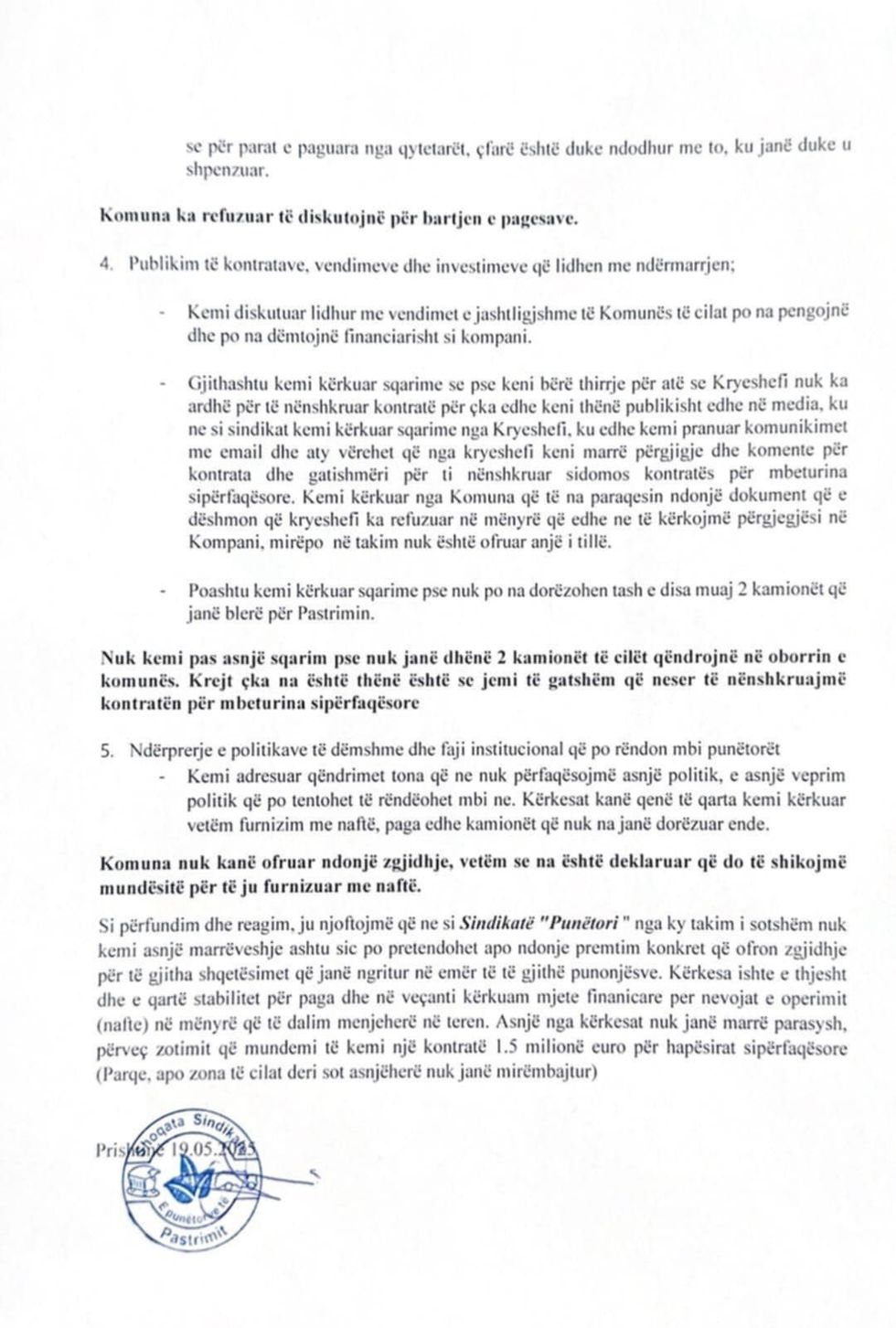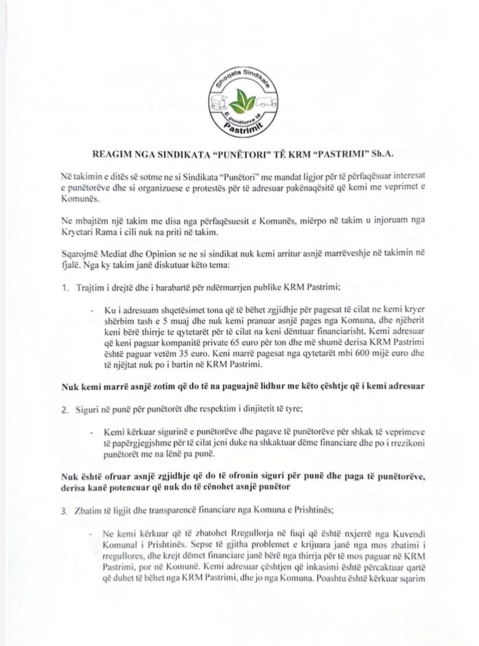 Në një komunikatë për media, Sindikata thekson se gjatë diskutimeve kanë kërkuar trajtim të drejtë dhe të barabartë për ndërmarrjen publike, si dhe zgjidhje për pagesat e shërbimeve të kryera tash e pesë muaj, për të cilat nuk kanë marrë asnjë kompensim nga Komuna.