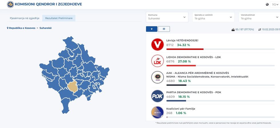 Rezultatet preliminare të KQZ-së për zgjedhjet për Kuvendin e Kosovës tregojnë se Lëvizja Vetëvendosje në Suharekë është partia më e votuar në raport me subjektet tjera politike.