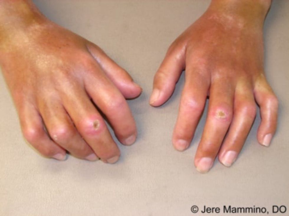 • Enët e kuqe të gjakut të zgjeruara në dhe rreth duarve, fytyrës, thonjve (të quajtura "telangiektazi").