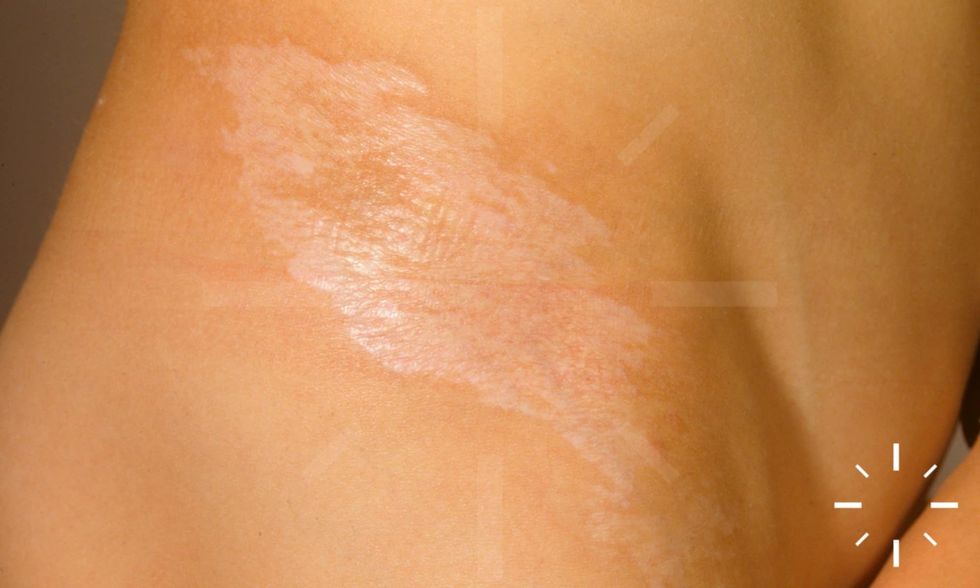• Morphea e lokalizuar: Morphea rrjedh nga fjala greke "morphi" që do të thotë formë ose strukturë. Në morfenë e lokalizuar, ka një ose disa lezione të sklerodermës në trup. Ka njolla ovale, të kuqërremta kryesisht në trung, shpinë, fytyrë, krahë dhe këmbë. Madhësia (diametri) e këtyre njollave të vendosura në pjesë të caktuara të trupit mund të variojë nga 1,5 cm deri në 30 cm. Gjëndrat e djersës zhduken në zonën e prekur dhe rritja e flokëve ndikohet.