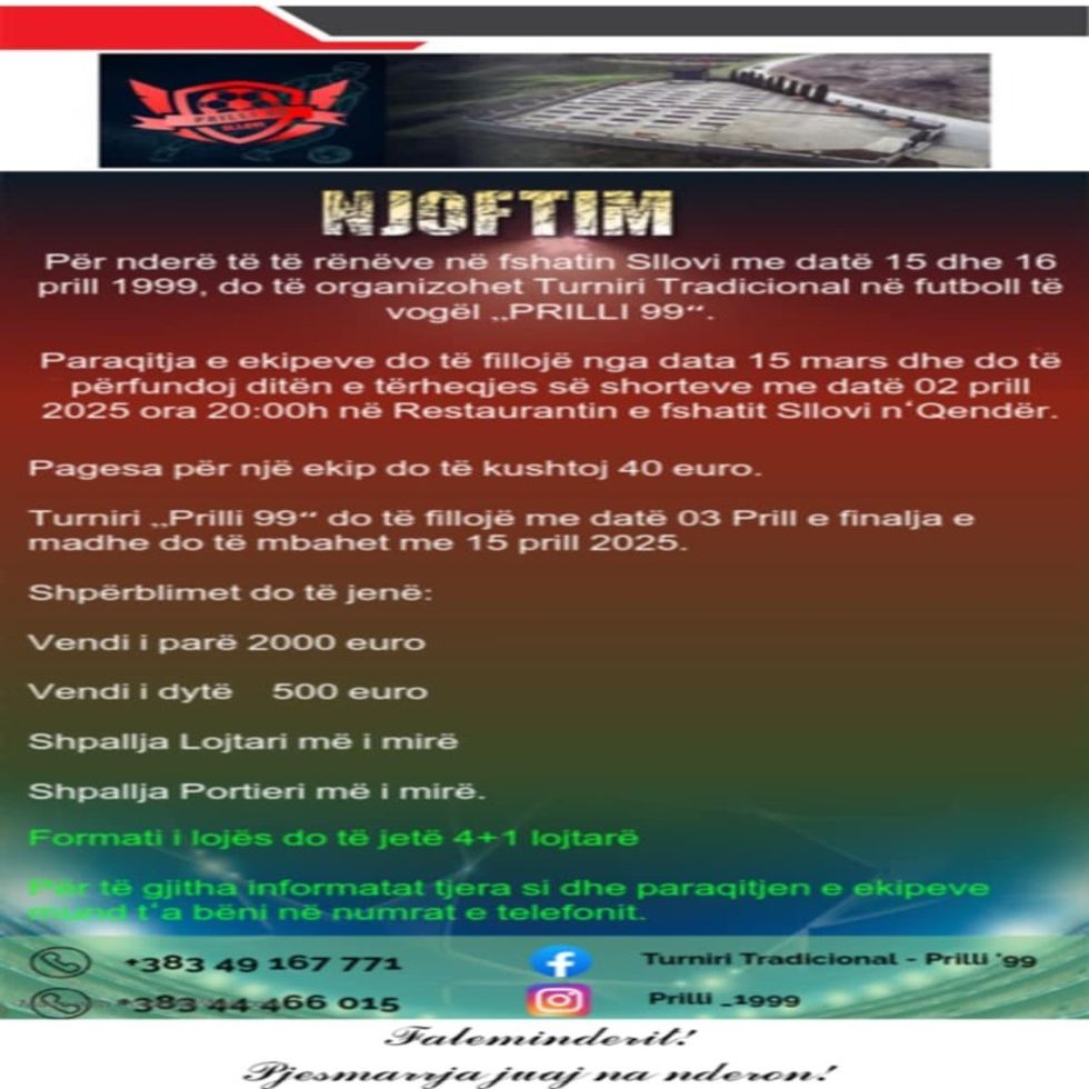 Këshilli organizativ në Sllovi të Lipjanit në bashkëpunim me qytetarët kanë organizuar disa aktivitete, por edhe një turnir të futbollit për nderë të dëshmorëve dhe martirëve të luftës së fundit në Kosovë. Sipas organizatorëve të turnirit, prilli i vitit 1999 gjithmonë sjellë vuajtje dhe dhimbje për viktimat dhe dëshmorët, andaj përmes aktiviteteve dhe turnirit tashmë tradicional do ta përkujtojnë ngjarjen e rëndë e cila kishte ndodhur saktësisht më 15 dhe 16 prill në të cilën kishin mbetur të vrarë e të masakruar 45 banorë.