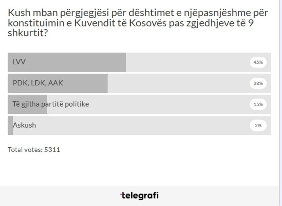 Pyetja e sondazhit ishte: “Kush mban përgjegjësi për dështimet e njëpasnjëshme për konstituimin e Kuvendit të Kosovës pas zgjedhjeve të 9 shkurtit?”.