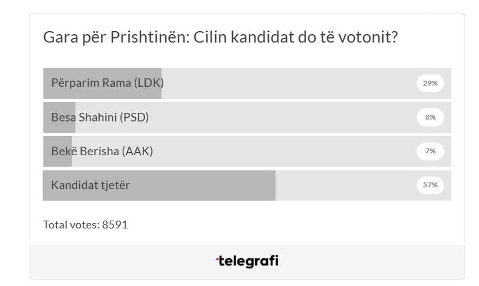 Telegrafi ka publikuar një sondazh online, ku mbi 8 mijë qytetarë kanë marrë pjesë, duke shprehur preferencat e tyre për kandidatin që do të mbështesin në zgjedhje, dhe rezultati është si më poshtë: