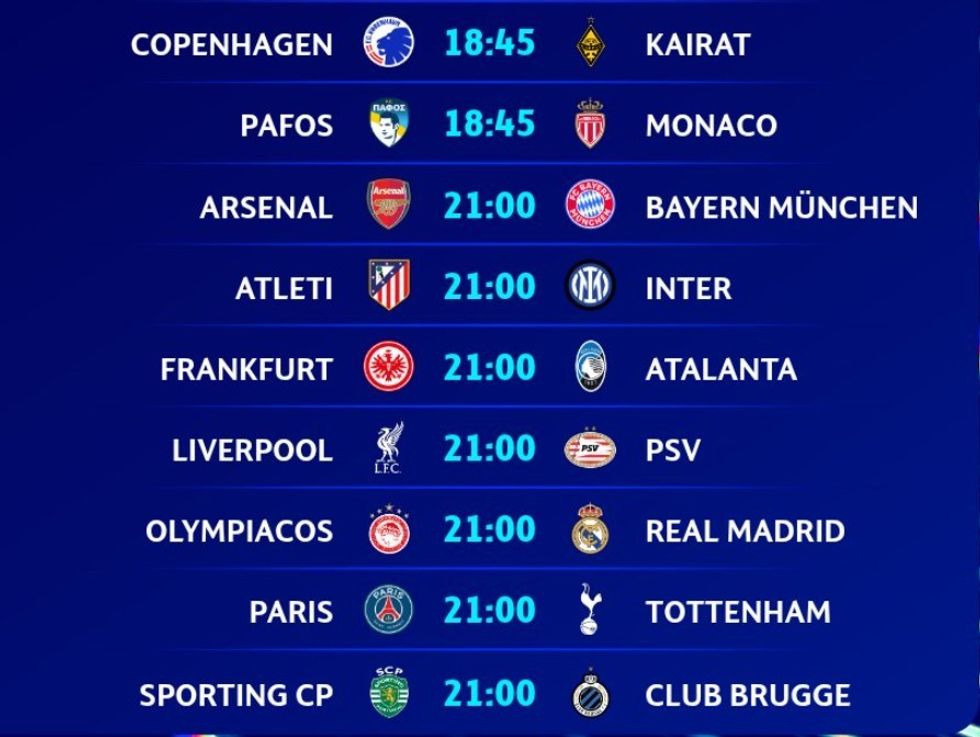 Gjatë orës 21:00 fillojnë edhe disa ndeshje tjera interesante sikurse ajo e Liverpoolit me PSV Eindhoven, Real Madridit në udhëtim te Olympiacosi, PSG-Tottenham Hotspur, Eintracht Frankfurt-Atalanta dhe Sporting Lisbona-Club Brugge.