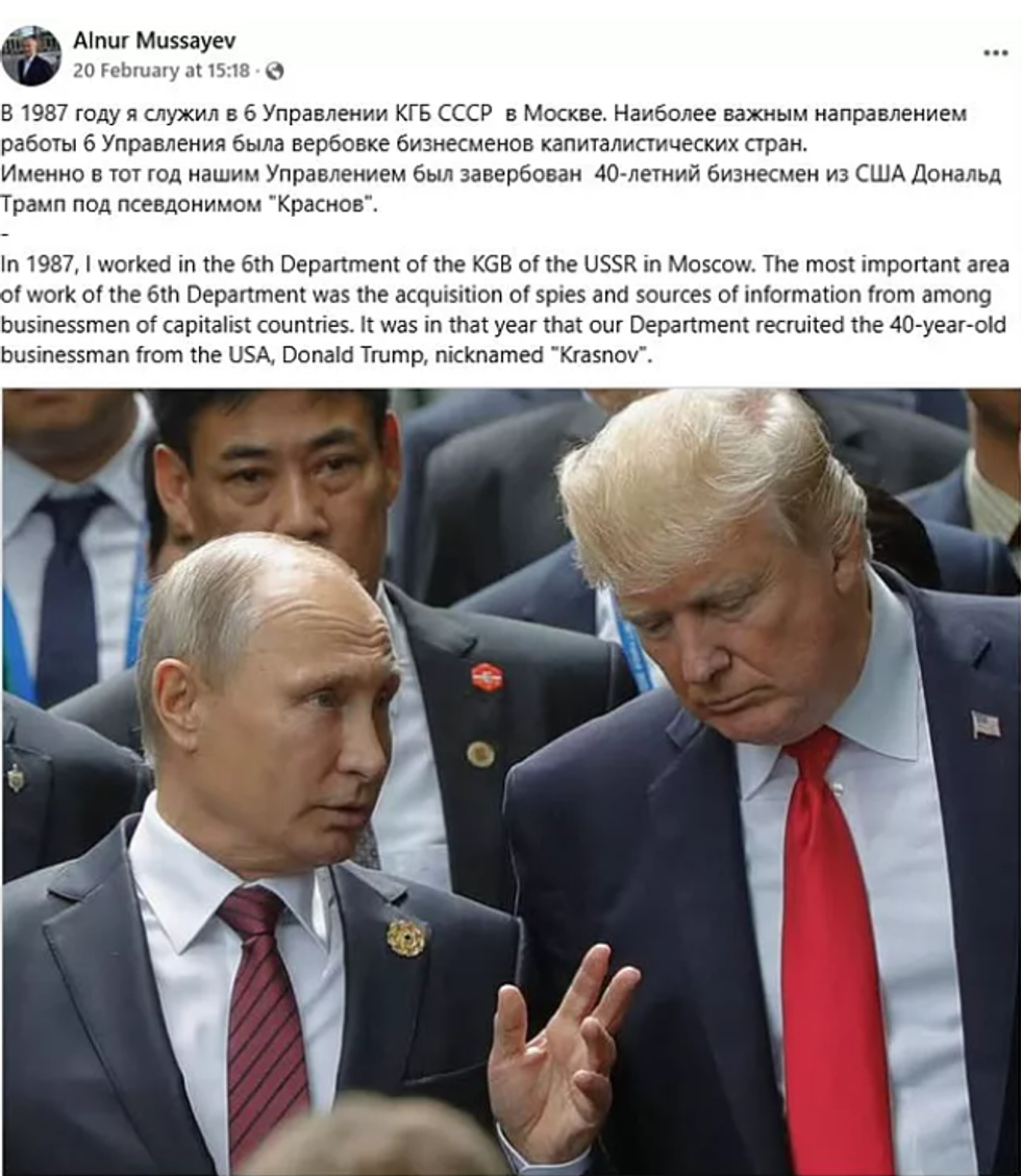 Në një postim në Facebook më 20 shkurt, Mussayev tha se Trump u regjistrua nga KGB-ja në vitin 1987 ndërsa ishte në një udhëtim në Moskë, atëherë në moshën 40-vjeçare, dhe iu dha emri i koduar "Krasnov".