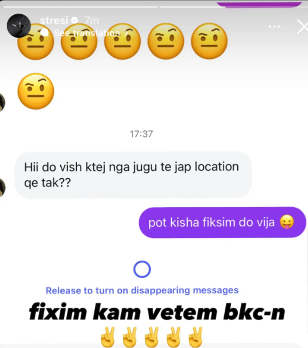 Së fundmi, një ndjekëse i ka dërguar një mesazh privat ku i shkruante: “Do vish këtej nga jugu të jap lokacionin”, duke lënë të kuptohet një ftesë flirtuese apo takim intim.