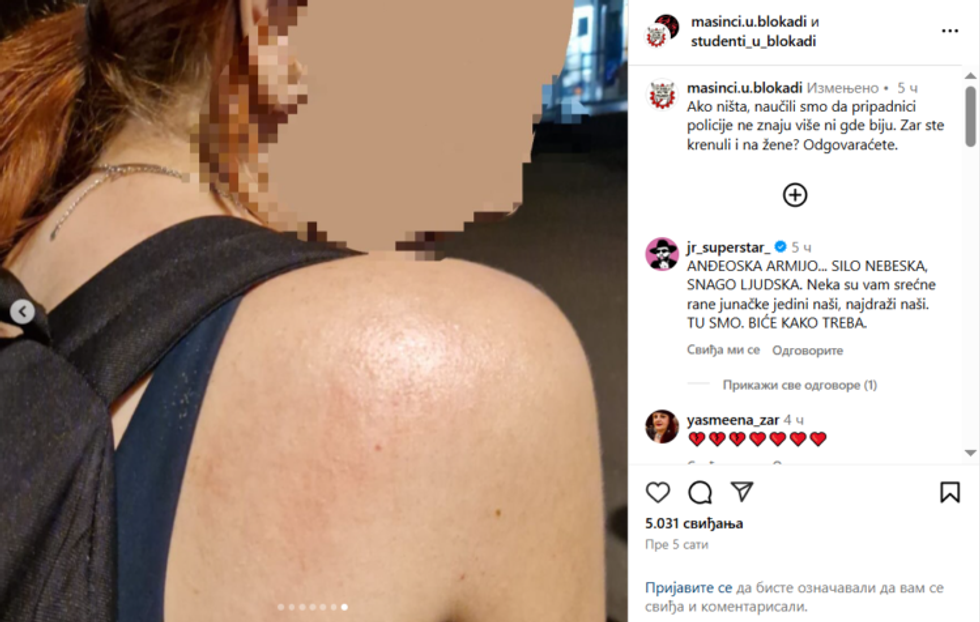 Profili në Instagram "Mashinci u blokadi", publikoi foto të një studenteje që u sulmua brutalisht nga policia gjatë aksionit të mbrëmshëm para fakulteteve teknike në Beograd, transmeton Telegrafi.