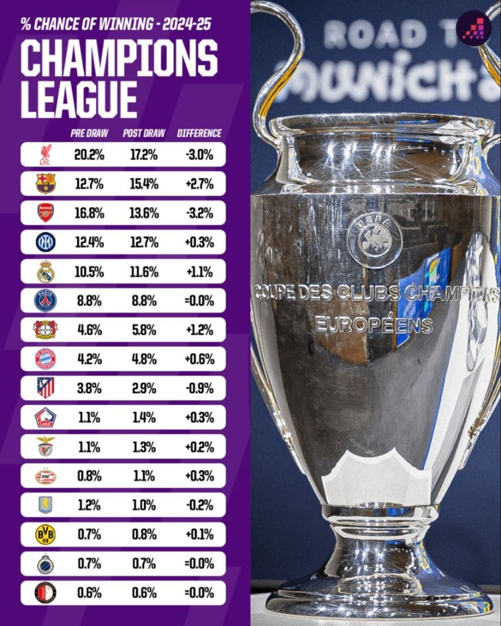 Paris Saint-Germain renditet pas Los Blancos me 8.8% shanse, ndërsa pas tyre vijnë Bayer Leverkusen me 5.8%, Bayern Munich me 5.8%, Lille me 1.4%, Benfica me 1.3%, PSV Eindhoven me 1.1% dhe Aston Villa me 1%.