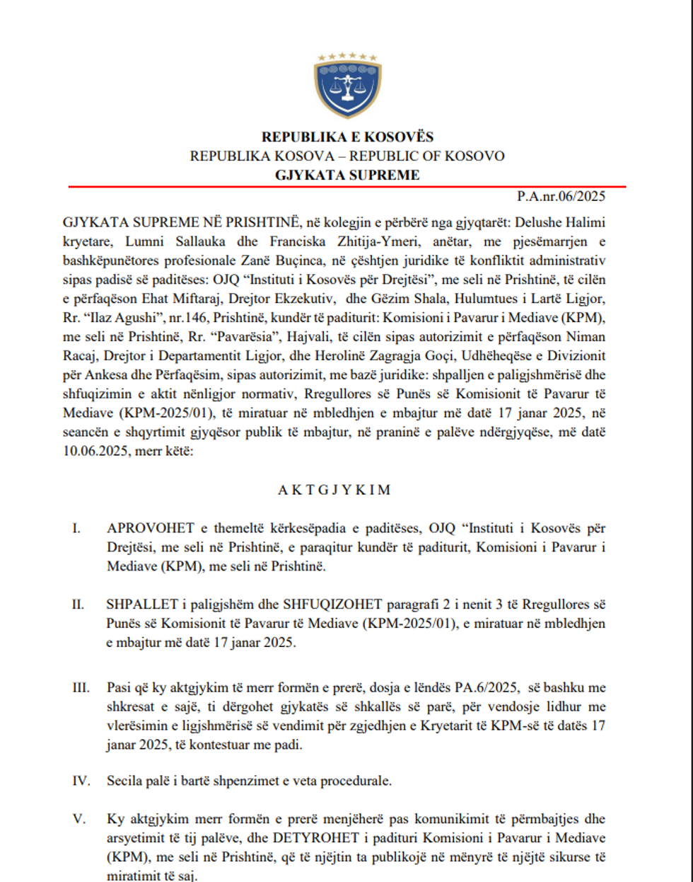 Gjykata Supreme ka aprovuar si të themeltë padinë e paraqitur nga Instituti i Kosovës për Drejtësi kundër Komisionit të Pavarur të Mediave (KPM), duke shpallur të paligjshëm dhe duke shfuqizuar një pjesë të Rregullores së Punës së këtij institucioni.