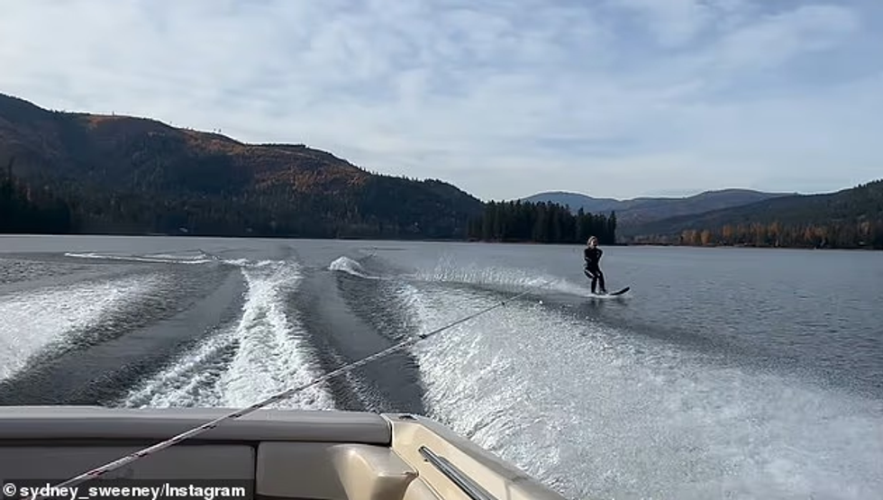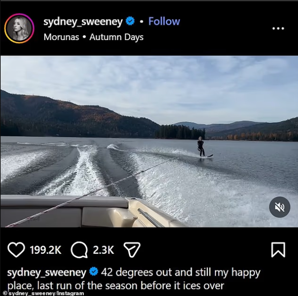 Sydney Sweeney zëvendësoi plazhet tropikale të Florida Keys me temperaturat e ftohta të një liqeni, ku ndau një video të saj duke rrëshqitur mbi ujë për Ditën e Falënderimeve.