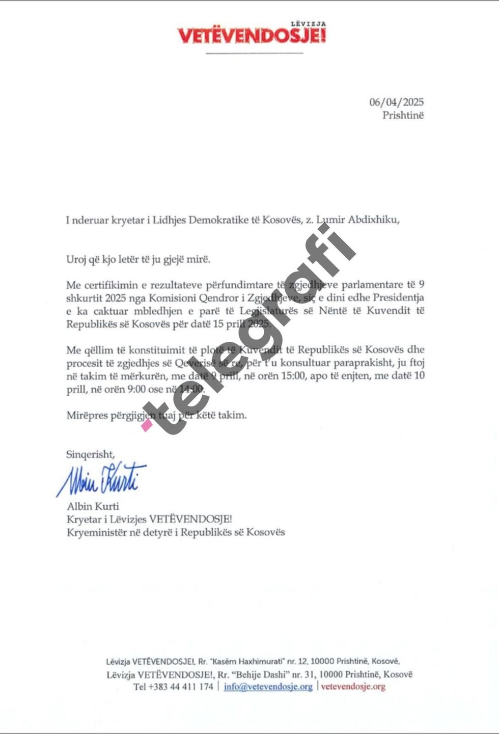 “Me qëllim të konstituimit të plotë të Kuvendit të Republikës së Kosovës dhe procesit të zgjedhjes së Qeverisë së re, për t’u konsultuar paraprakisht, ju ftoj në takim të mërkurën, me datë 9 prill, në orën 15:00, apo të enjten, me datë 10 prill, në orën 9:00 ose në 14:00”, thuhet në letrën që Kurti ia ka dërguar Abdixhikut.