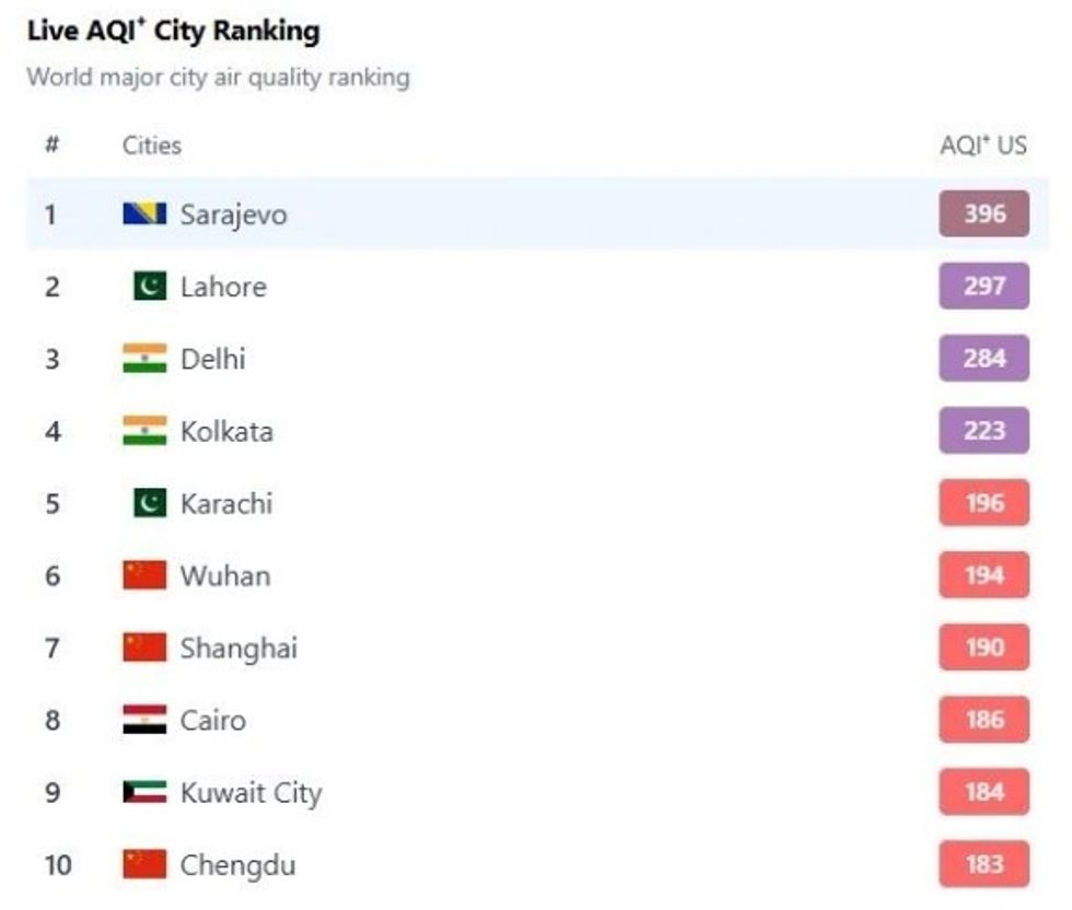 Pas Sarajevës renditet Lahori i Pakistanit, ku indeksi i cilësisë së ajrit është regjistruar 297, ndërsa në Delhin e Indisë 284.