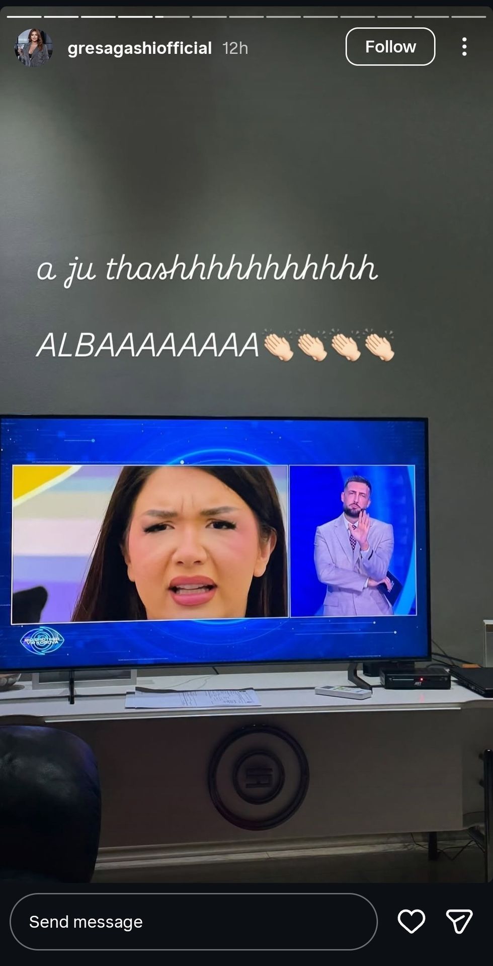 Në një postim tjetër, ku shfaqet Alba në ekran, Gresa entuziazmohet: “A ju thashhhhh… ALBAAA,” duke duartrokitur guximin e banores për t’u përballur me “Vëllain e Madh”. /Telegrafi/