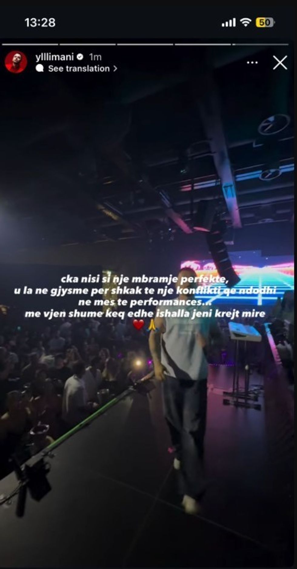 Ylli Limani ndaloi performancën dhe më pas reagoi në rrjetet sociale, duke shprehur keqardhjen për atë që ndodhi: “Çka nisi si një mbramje perfekte, u la në gjysmë për shkak të një konflikti që ndodhi. Më vjen shumë keq edhe ishalla jeni krejt mire”.