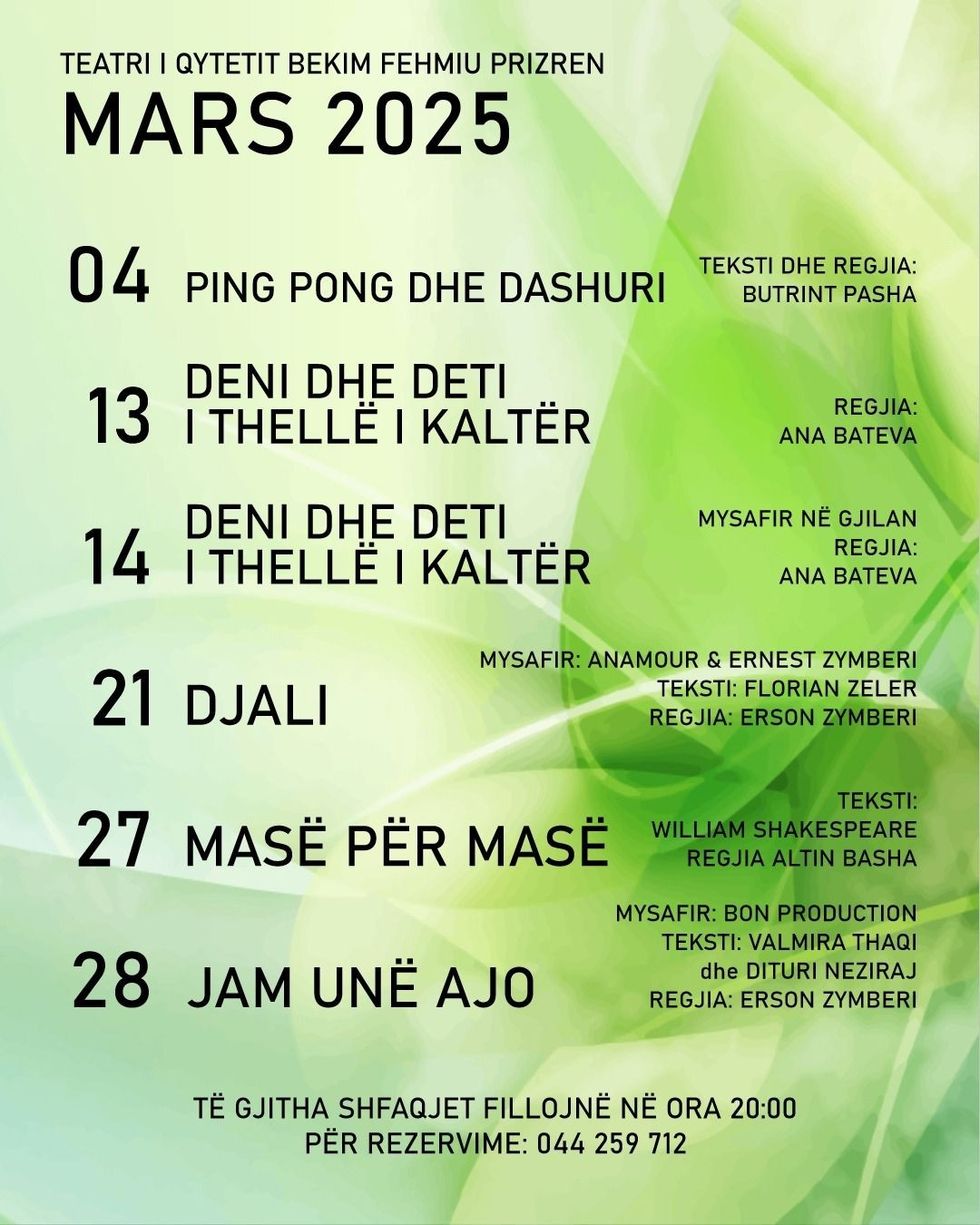 Teatri “Bekim Fehmiu” në Prizren ka publikuar programin e shfaqjeve për muajin mars.
