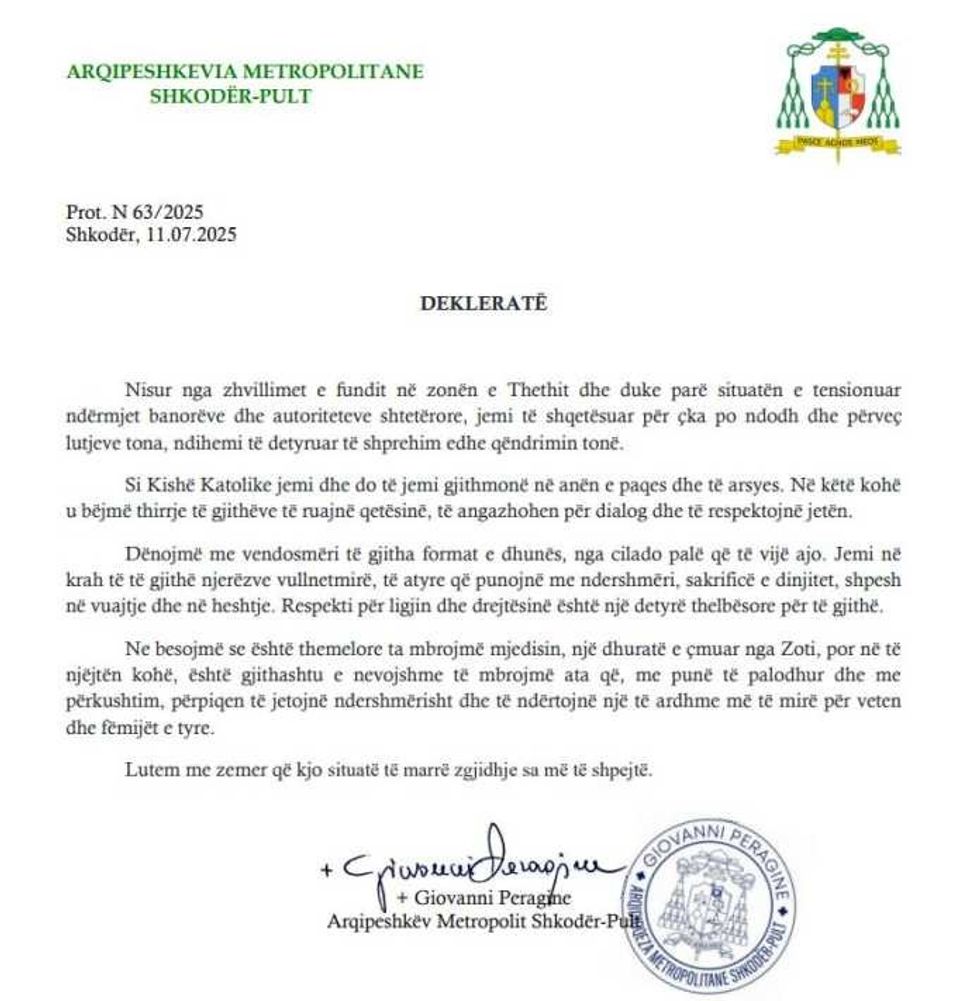 Në lidhje me tensionet e krijuara në zonën e Thethit, pas aksionit të IKMT për prishjen e ndërtimeve të ngritura pa leje, Arqipeshkvia Shkodër-Pult ka reaguar me një deklaratë publike.