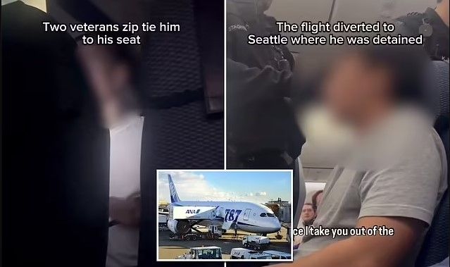 Tentoi të hapë derën emergjente të aeroplanit derisa po udhëtonin, dy veteranë e lidhin për karrige pasagjerin e linjës Tokio-Houston