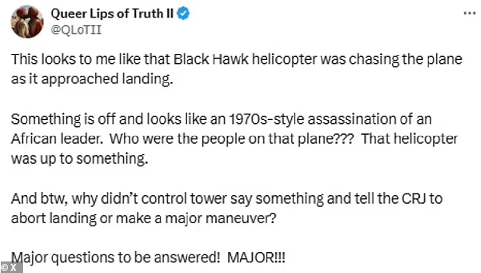 Teoricienët e konspiracionit po bëjnë pretendime të pabazuara se përplasja vdekjeprurëse që pa një helikopter të Army Black Hawk duke u përplasur me një aeroplan pasagjerësh ishte i qëllimshëm.
