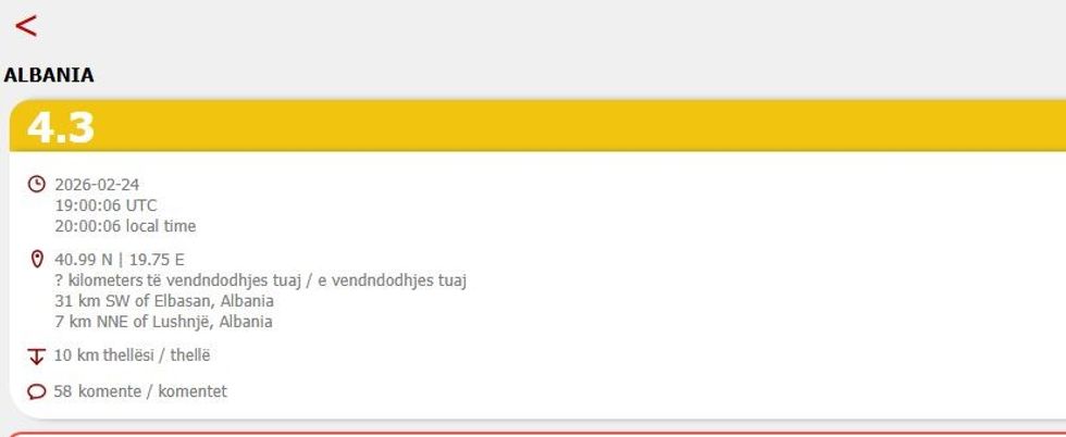 Sipas të dhënave të para, tërmeti ka pasur magnitudë 4.3 ballë të shkallës Rihter, me një thellësi prej 13 kilometrash.
