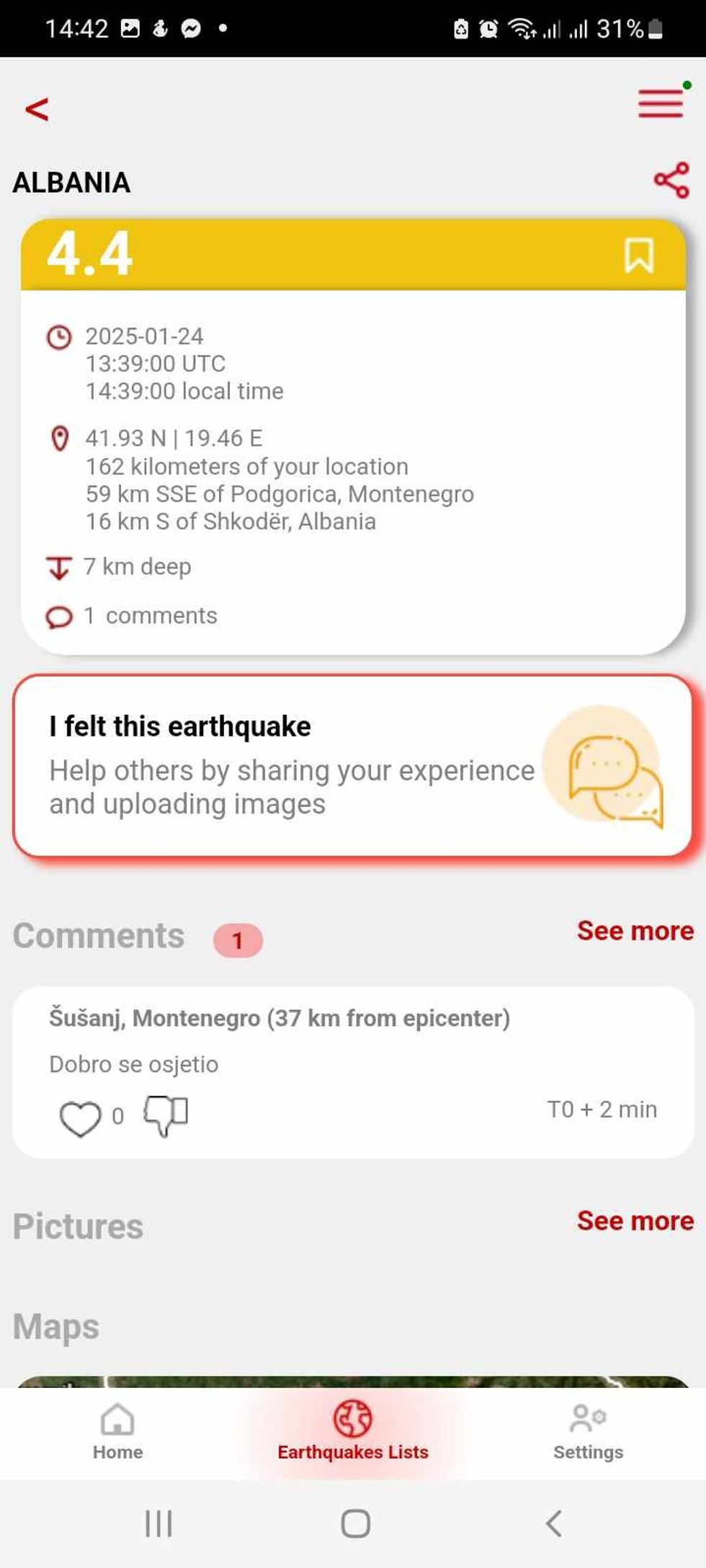Ndërkohë, aplikacioni raporton se lëkundja u ndje në orën 13:39, 16 kilometër në jug të qytetit të Shkodrës.