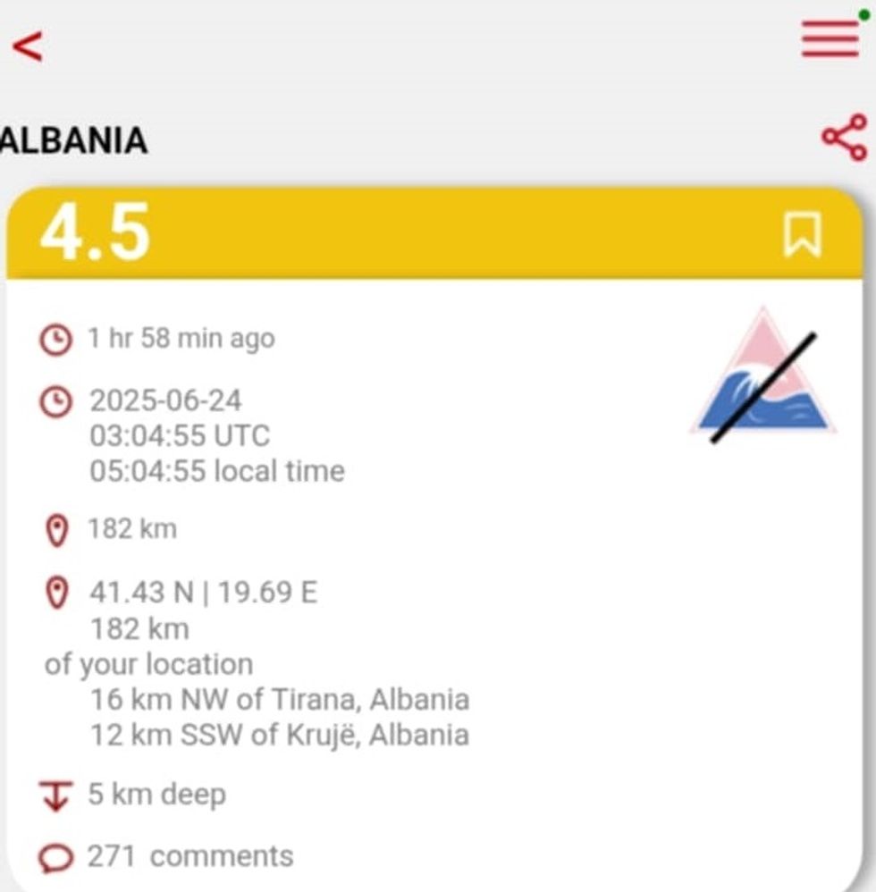 Tërmeti i parë me magnitudë 4.5 është regjistruar në ora 05:04, 16 kilometra në veriperëndim të Tiranës.