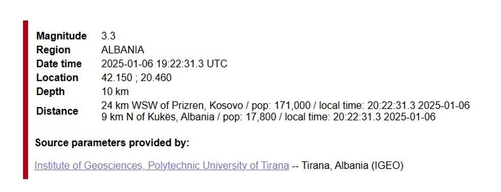 Një tërmet me magnitudë 3.3 ka goditur veriun e Shqipërisë mbrëmjen e sotme, më 6 janar 2025, dhe është ndjerë edhe në disa pjesë të Kosovës.