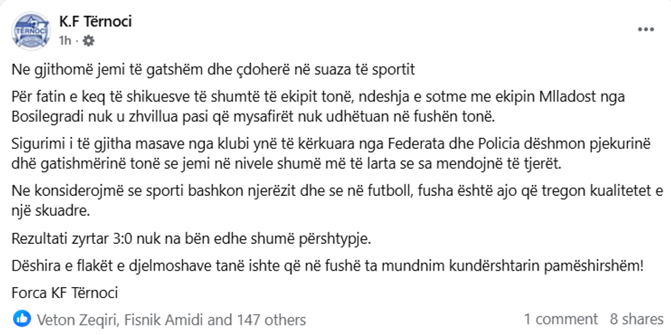 "Ne gjithmonë jemi të gatshëm dhe çdoherë brenda suazave të sportit. Për fatin e keq të shikuesve të shumtë të ekipit tonë, ndeshja e sotme me Mladostin nga Bosilegradi nuk u zhvillua pasi mysafirët nuk udhëtuan në fushën tonë. Sigurimi i të gjitha masave nga klubi ynë, të kërkuara nga Federata dhe Policia, dëshmon pjekurinë dhe gatishmërinë tonë, që janë në nivele shumë më të larta se sa mendojnë të tjerët. Ne konsiderojmë se sporti bashkon njerëzit dhe se në futboll, fusha është ajo që tregon kualitetet e një skuadre. Rezultati zyrtar 3:0 nuk na bën shumë përshtypje. Dëshira e flakët e djelmoshave tanë ishte që në fushë ta mundnim kundërshtarin pamëshirshëm! Forca KF Tërnoci!", thuhet në njoftimin e klubit shqiptar.